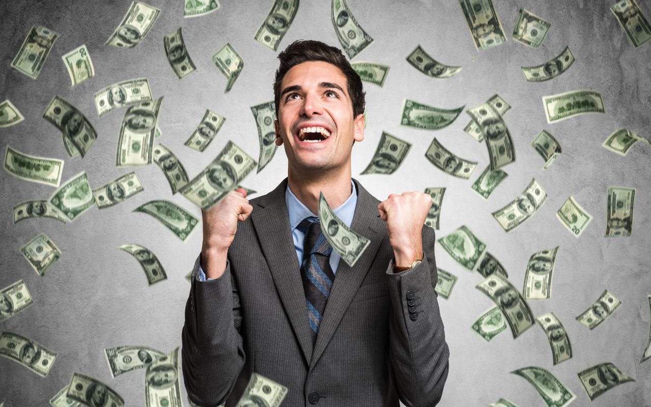 Persona joven celebrando el éxito financiero con billetes y gráficos de crecimiento, simbolizando cómo ser millonario en Perú.